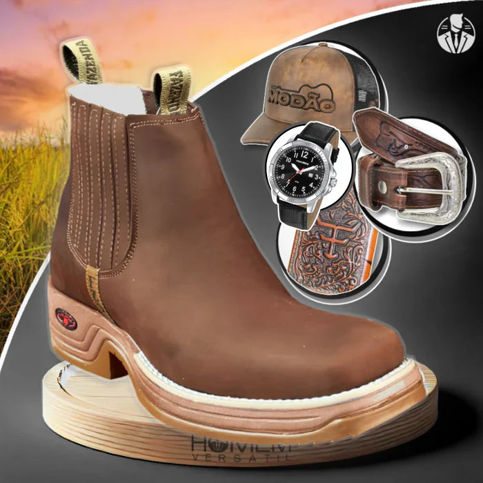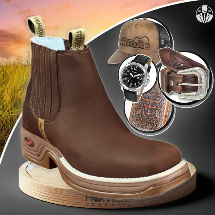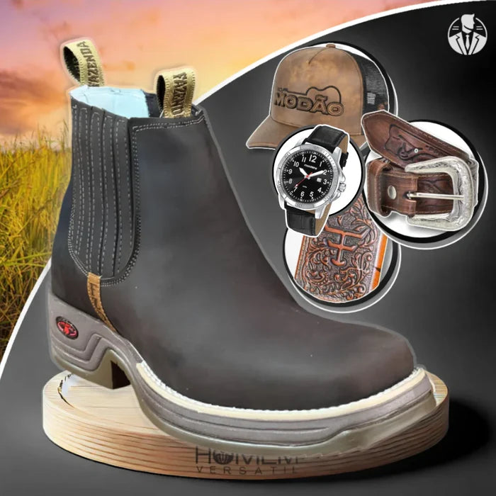 Não é qualquer botina, é resistência de verdade! Feita em 100% couro bovino legítimo, a Bota Fazenda encara qualquer terreno, do asfalto ao barro, sem perder o estilo. O couro se adapta ao seu pé com o tempo, trazendo um conforto que só melhora. Nada de calçado descartável, isso aqui é feito para durar!